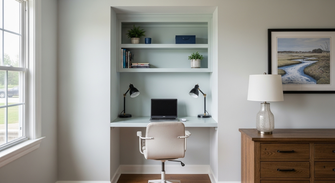 책상 위 벽면에 선반을 설치하여 수납공간을 확보하세요. 높이 180cm 이하로 설치하면 앉아서도 쉽게 접근 가능하며, 3단 선반으로 구성하면 책과 사무용품을 체계적으로 정리할 수 있습니다.